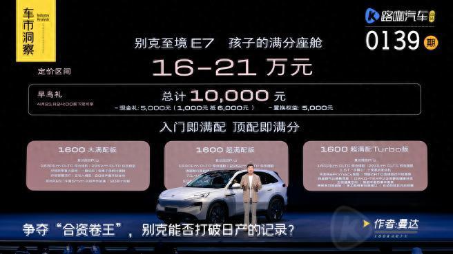 国产车该慌吗?作为别克至境品牌下的第二款车,至境E7的定价逻辑跟第一款车L7明显不同。去年9月,别克至境品牌首款车型至境L7正式上市,限时权益价为16.99-21.59万元。不到17万元,就能买到一台轴距3米的合资豪华新能源中大型轿车,按理说,至境L7已经有了成为爆款的理由,但从之后市场销量看,至境L7并没有溅起太大的水花。