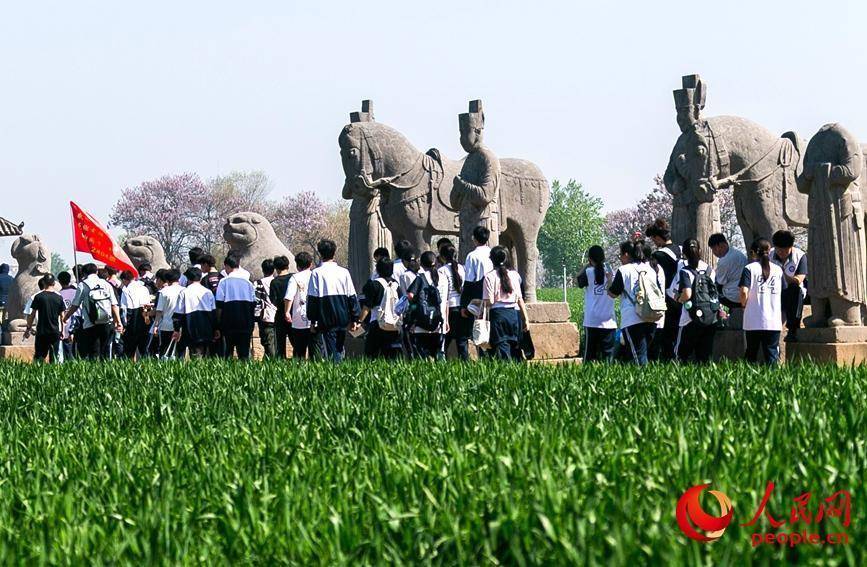 这场发生在永泰陵麦田里的问答,是巩义市第三高级中学百余名学生参与研学活动的一幕。2025年夏收时节,一组“千年宋陵与金色麦浪同框”的绝美照片火爆全网,超3.2亿次的传播量,让人们重新认识了这座“露天石刻艺术博物馆”。